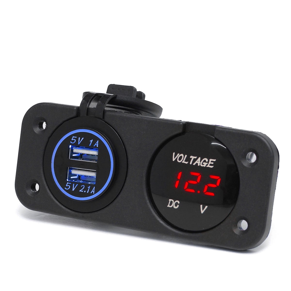 Item specifics:Color: BlackMaterial: Nylon+MetalUSB Power Socket Size: about 50x36.5mmVoltmeter Size:about 36x15mmPanel Size: about 105x45x55mmInstall Hole: 29mmWithout Cigarette Lighter Function. Short circuit / overheat protection. USB outlet 5V up to 2.1A, Waterproof protective caps and USB cover. Multifunctional product with blue LED indicator light, perfect for travel use. Waterproof dustproof material can be used for the interior and exterior application. Can be installed vertically, horizontally or underneath the dash, or any flat surface. Widely used with electric equipment for power supply: Vehicle, GPS, mobile phone, camera, mp3 (can smoke)Optimised for iPad, iPhone & iPod - fast charging at full speed (2.1Amps for iPad, 1Amp for iPhone/iPod).Apply to all USB charging mobile phones or other electronic products. Run multiple accessories at one time, very convenient and easy to use. Cautions:Check maximum voltage on devices to charged in advance. Always cover outlets when noy in use to aviod dust and water entering. This product is for 12/32V vehicles only. Only use on voltage specificed. Do not operate this device while driving. Voltmater Specifications:Material:Environmental protection plasticPower supply: DC12-24VMeasuring range: 6-30VMeasurement accuracy: ±0.1%Color: red, green, whiteOperating temperature: -10°C to 65°CInput impedance:100KOuter diameter:36 mmThread diameter:29 mmThickness:15 mm Package Included:1x 12-24V Dual USB Socket Mount Car Charger Adapter+LED Digital Display Voltmeter4 x Screws4 x Insulated Terminals