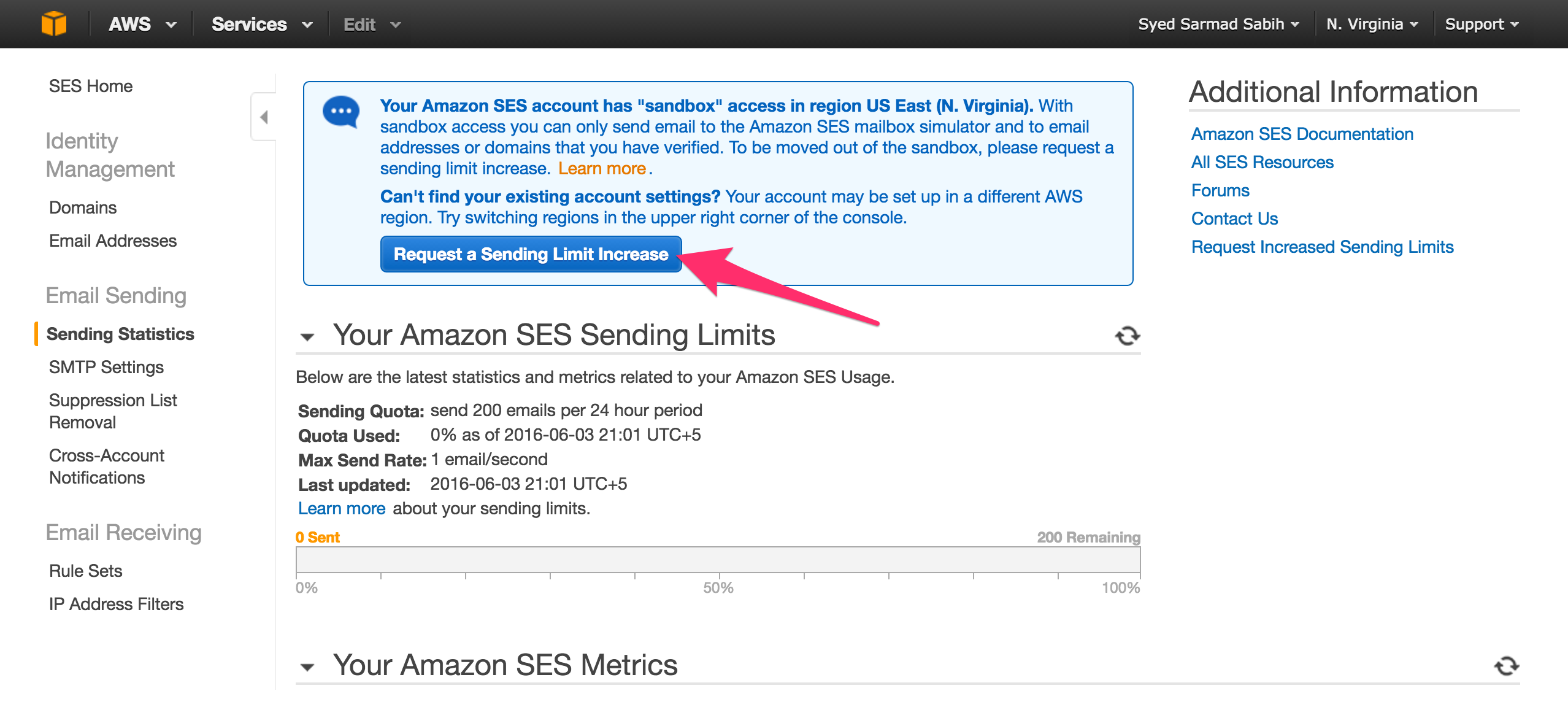 As we discussed that we’re going to be sending emails from Amazon SES Sandbox for this post. You can request Amazon to move you out of the Sandbox from here