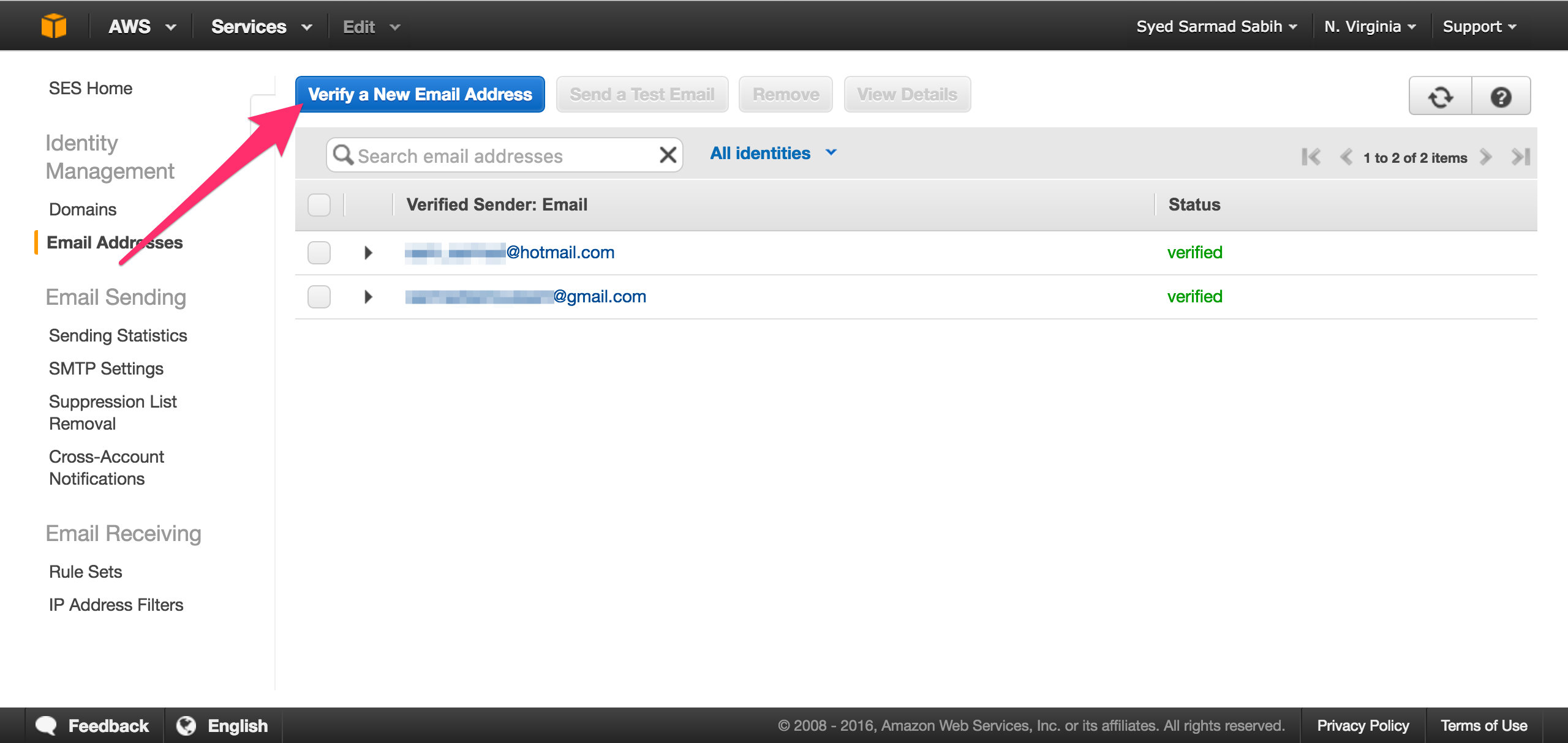 Click on “SES” to go to the Amazon SES Dashboard. Click on “Email Addresses”