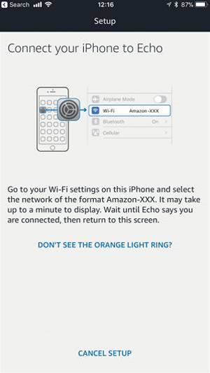 6. The next step involves connecting the app to your Echo, and connecting your Echo to your Wi-Fi network. On the Begin Echo setup screen click Connect to Wi-Fi. The orange ring should now appear on your device. If the orange light still doesn’t appear, go to step 11.