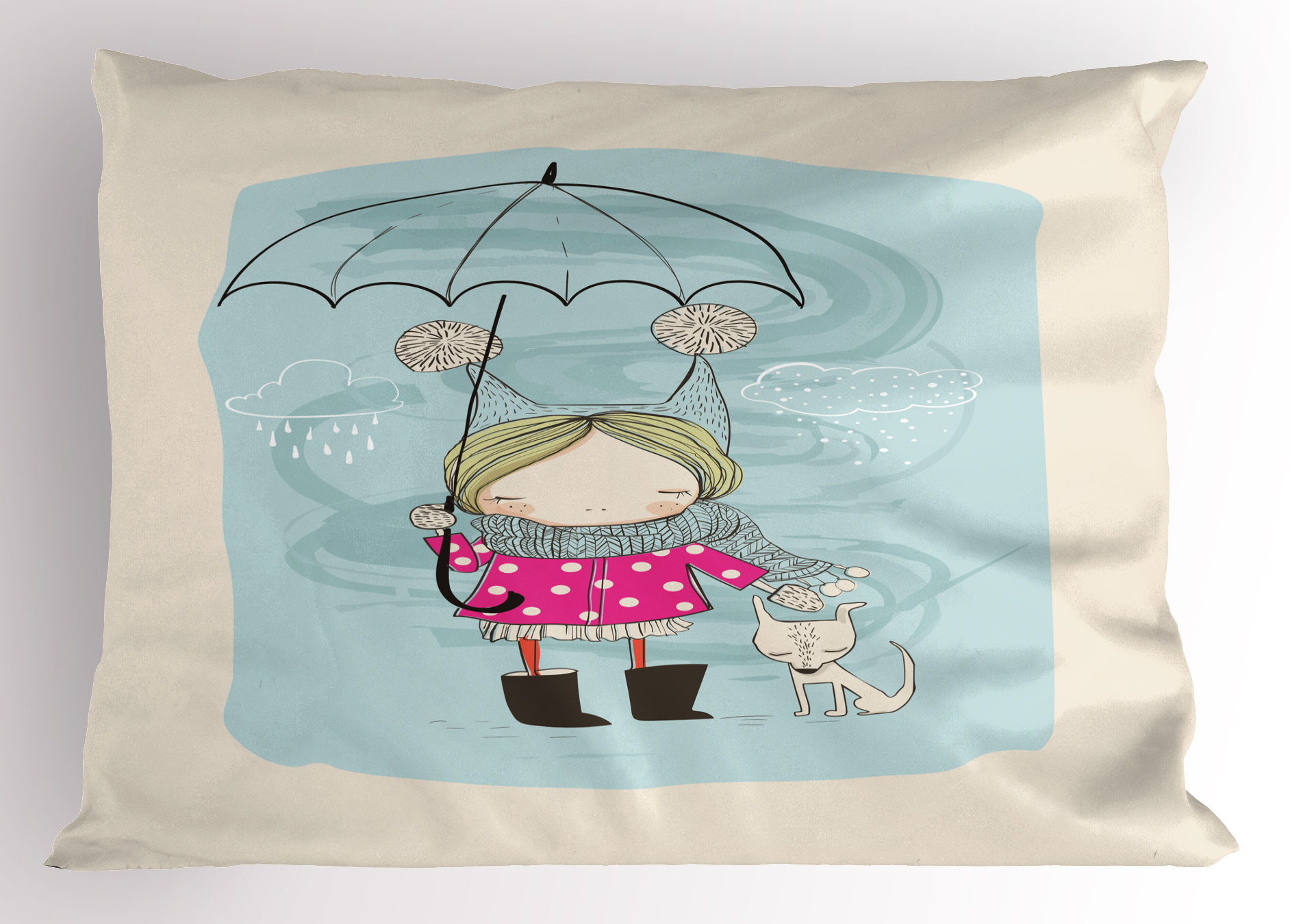 Kids Pillow Sham Little Girl Illustration in Winter Clothes Umbrella and a Cute Dog in Rainy Weather, Decorative Standard Queen Size Printed Pillowcase, 30 X 20 Inches, Multicolor, by Ambesonne